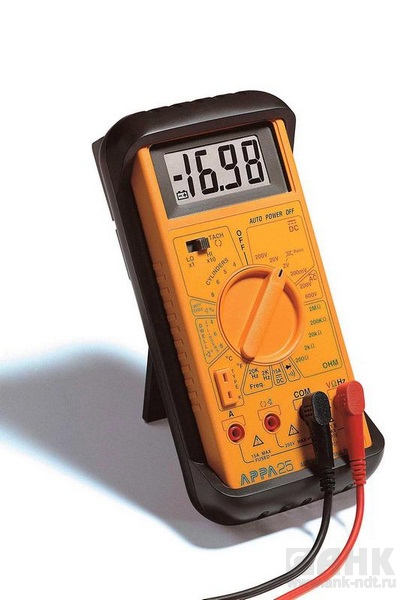 Автомобильный тестер APPA 25: Постоянное/переменое напряжение до 600В; Постоянный ток до 15А; Измерение сопротивления до 2МОм; Измерение частоты до 20кГц; УЗСК (4/6/8 цилиндров); Тахометр (4/5/6/8 цилиндров); Измерение температуры до 800°С; Измерение скважности; Прозвон цепи; Испытание P-N; Цифровой; Питание 9 В.
