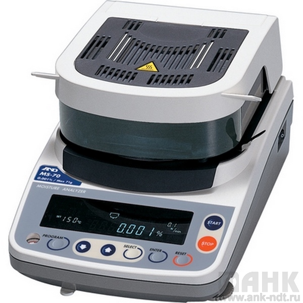 Анализатор влажности предназначенный для экспресс-анализа влажности продукции. Влагомер AND ML-50 — устройство измеряющее влагу термографическим методом. Состоит влагомер AND ML-50 из двух частей: аналитические весы и сушильный блок. Принцип работы анализатора влажности AND ML-50 состоит в анализе влаги испаряющейся при нагревании образца. Производится следующая последовательность действий: