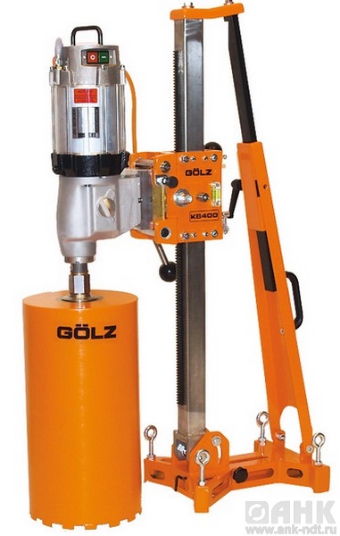 Установка алмазного бурения Goelz КВ-400 рассчитана на бурение бетона, армированного бетона, природного и синтетического камня, асфальта, алмазными колонковыми бурами с подачей воды для отверстий диаметром от 50 до 400 мм.