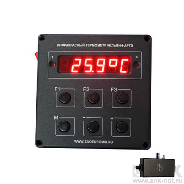 Пульт управления термометром может быть удалён от датчика на значительное расстояние. Он также выполнен в прочном металлическом корпусе, снабжен удобным индикатором и обеспечивает все необходимые для контроля технологического процесса режимы работы: ввод излучательной способности измеряемого материала, индикацию текущей и максимальной температуры, контроль достижения установленного порогового значения температуры с помощью индикатора и группы контактов реле. Предусмотрена связь с компьютером для регистрации температуры и преобразования (с помощью встроенного или отдельного дополнительного устройства) значения температуры в аналоговый токовый сигнал «4-20мА».